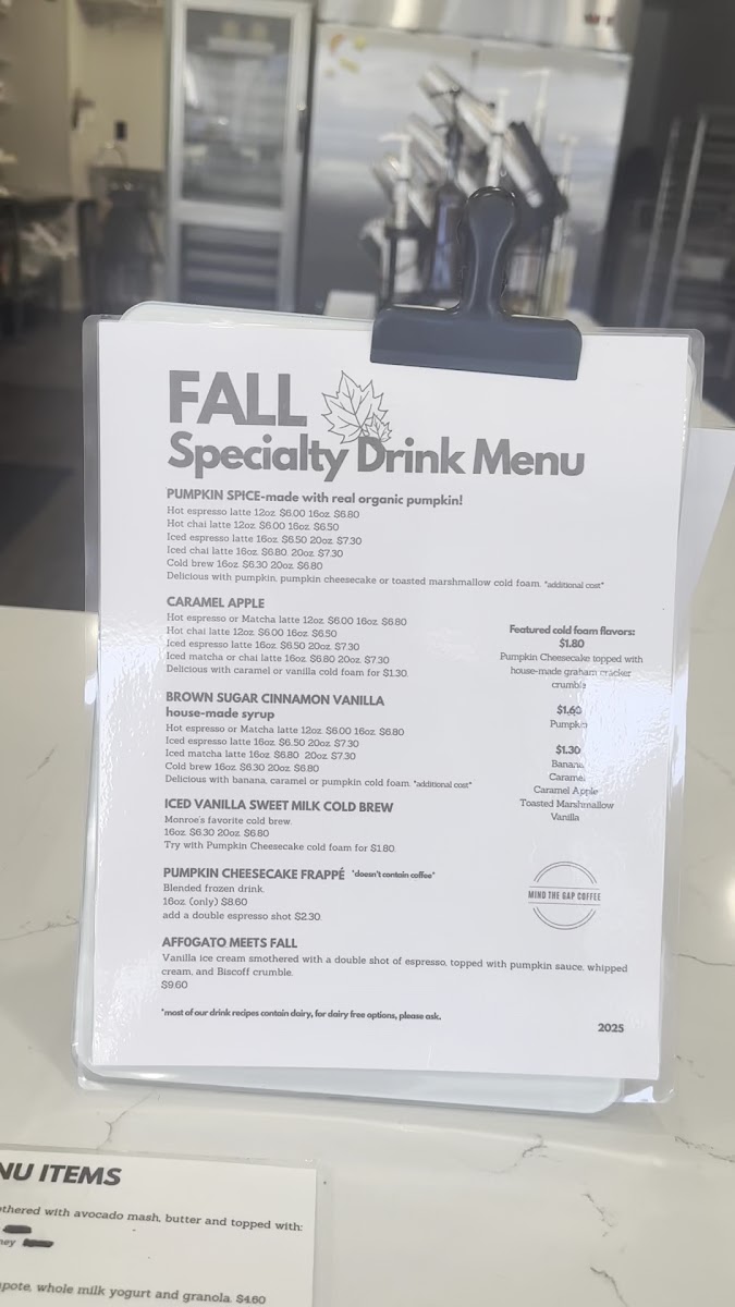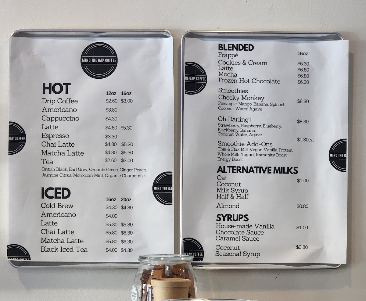 The menu at Mind The Gap Coffee reflects the cozy and approachable vibe of this neighborhood café. It features a thoughtful selection of comforting drinks alongside simple, satisfying bites that suit a range of daily moments—from a quiet morning coffee to a mid-afternoon pick-me-up.